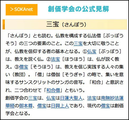 「『僧宝』とは正宗においては第二祖日興上人のことであり、また第三代会長も発言しているごとく、唯授一人の血脈をうけられた御法主上人猊下であらせられます。(略)また、広義においても、学会を『僧宝』という言い方はしてはならないことであります」(創価学会発行『特別学習会テキスト』41㌻)