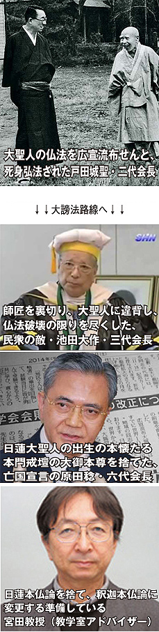 池田は戸田先生と真逆路線へ→日蓮大聖人と決別! ■■■『日蓮本仏論を捨てた創価学会』■■■ 【宮田教授(創価学会教学アドバイザー)語録抜粋】 ●11:58 日蓮にあまりに執着しすぎるために、現代では適応できない日蓮の教義すら絶対の真として執着する。そりゃ直したほうがいいんじゃないの? ●17:11 教義についてはSGIは先行している。SGIのHPの日蓮(項目)には、仏陀=釈尊→法華経→日蓮。SGIには日蓮本仏論などこんなものはない。 ●21:09 基本的には、日蓮正宗は日蓮に真があったんだという前提で、いくつかの怪しげな御書を引用して頑張ってるわけですけど、(創価学会は)基本的にそれはもうやめようと、日蓮大聖人本人が日蓮本仏論をもっていたという立場はもうとらない。しかし、我々(創価学会)が信仰のモデルというか、どういうことをやるのかというお手本として、日蓮本仏論というのを作り直すことができる。 ■なぜ創価学会は2015年11月8日、 勤行改訂で「日目上人への報恩」を削除したか!? 創価学会が、日蓮宗(大石寺以外の日興上人門流)から日蓮大聖人御真筆の御本尊を購入すれば、日興上人までの付属と、釈迦本仏論の両方が成り立ち、新たな総本山が手に入る。よって、日目上人以降は僧宝として認められない(勤行から外す)という戦法であろう。 |