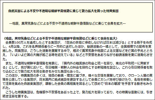 〈地震,異常気象などによる不安や不透明な朝鮮半島情勢などに乗じて会員を拡大〉 |