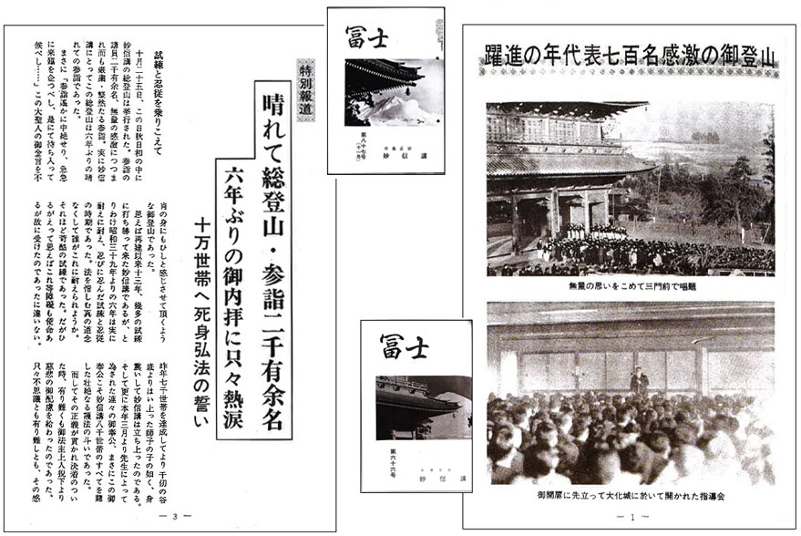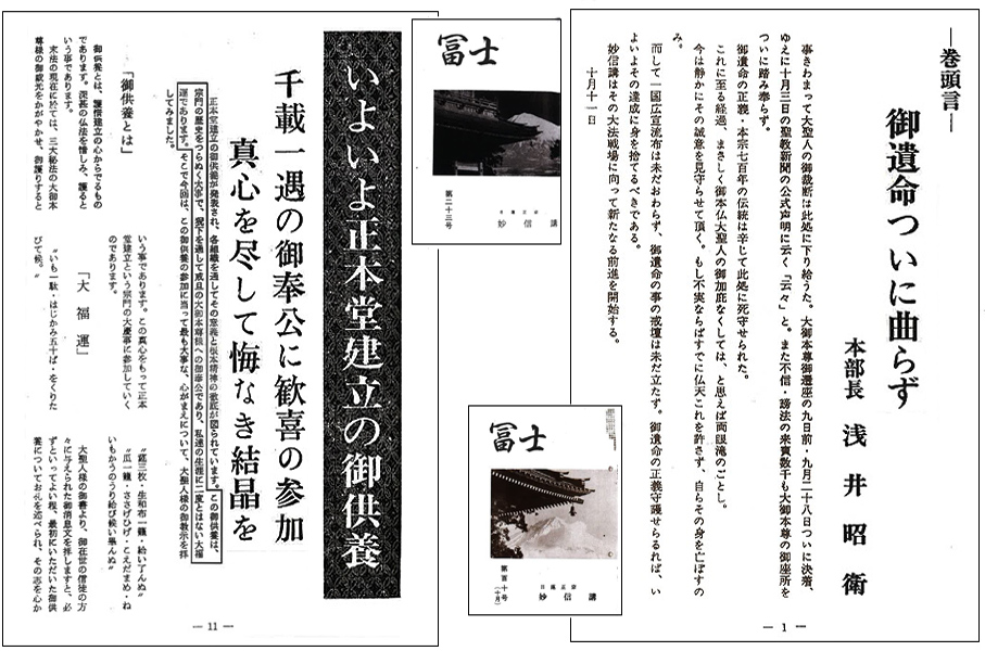 御遺命違背の謗法の山と罵るならば、登山して喜んでいる場合ではない。謗法与同ではないか。しかも同号において「日寛上人の仰せに云く、三大秘法いま大石寺にあり」と小見出しを付け述べる様は、本門三大秘法、本門戒壇の大霊地こそ総本山大石寺と、浅井妙信講が定め、その当時は御遺命破壊だとは思って なかった何よりの証拠ではないか如何。