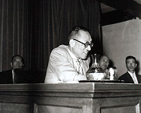 いいか、もう一度言うよ。折伏することと、お寺へ尽くすことと、御本山への御奉公は、当たり前のことなんですよ。それをしたからって、なにも偉いんじゃないんだよ。ここに寺が建った以上は、この寺を大事にしてもらいたい。坊さんが飯を食えんなんて事のないように、ちゃんとしなさいよ。お正月あたりには、御本尊様への御奉公として、餅の一切れや二切れ持ってきて御本尊様の前に供えるような事を忘れちゃいけませんよ。わかりましたね。 ただし、御住職を威張らしてはなりませんぞ。お世話を申し上げ、お寺のご奉公は当然であるけれども、昔から悪い癖がある。坊さんは、信者を家来か召使 いのごとく思う悪い癖がある。断じて、高崎では、そうであってはなりませんよ。弟子・檀那と申しまして、御僧侶方が将校でありますれぱ、われわれは兵隊 であります。しかし、折伏戦という大闘争となった時に、将校が動かないからといって兵隊は黙って見ているわけにはいきません。将校を乗り越えて闘争しなければならないのです。この点をよく腹に入れて頂きたい。 |